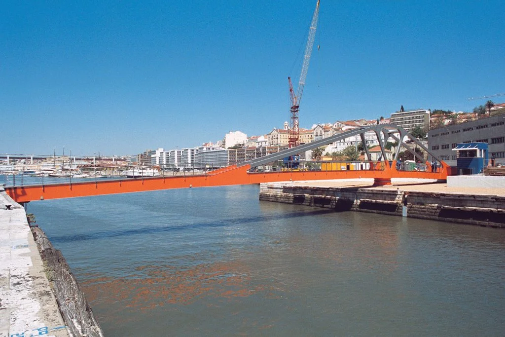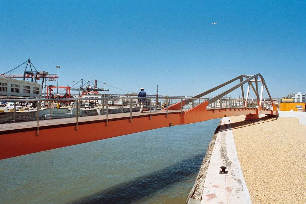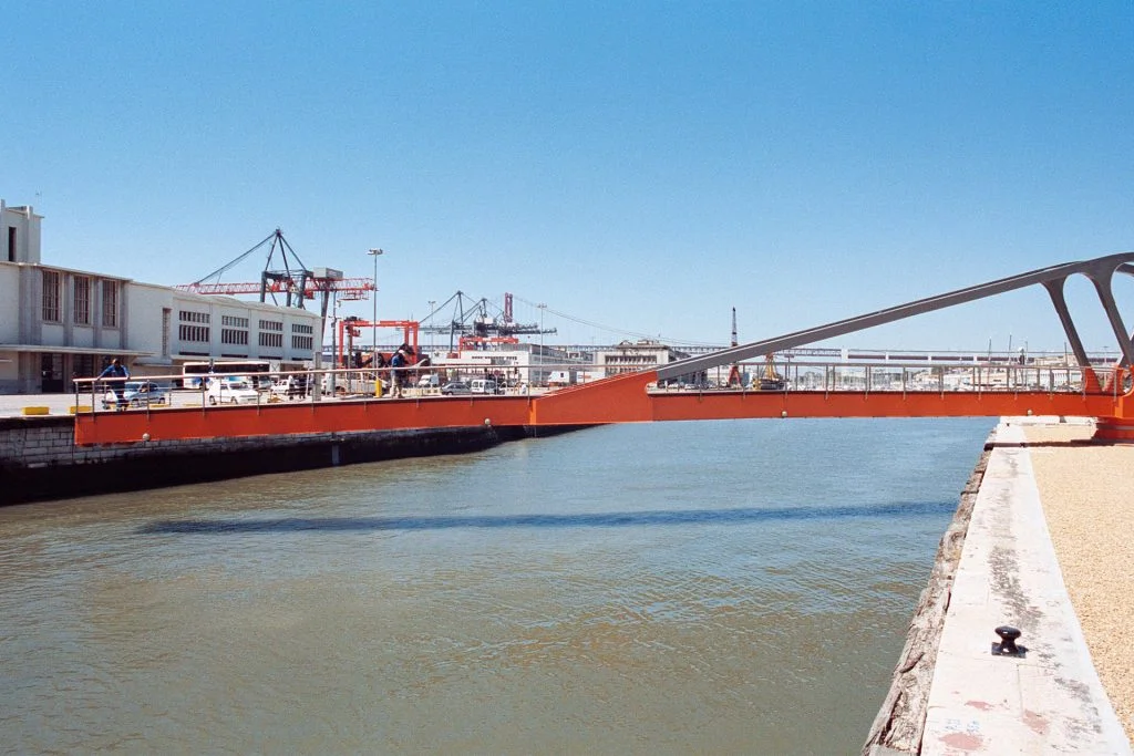 Ponte metálica rotativa, acionada por sistema óleo-hidráulico, por meio de 3 motoredutores. Comando automatizado, programável em cabine local e à distância, com transmissão de sinais por fibra óptica. Equipada com sistemas de vigilância e sinalização (CCTV e som), quadros digitais de informação aos pedestres e ao tráfego marítimo e cancelas basculantes.