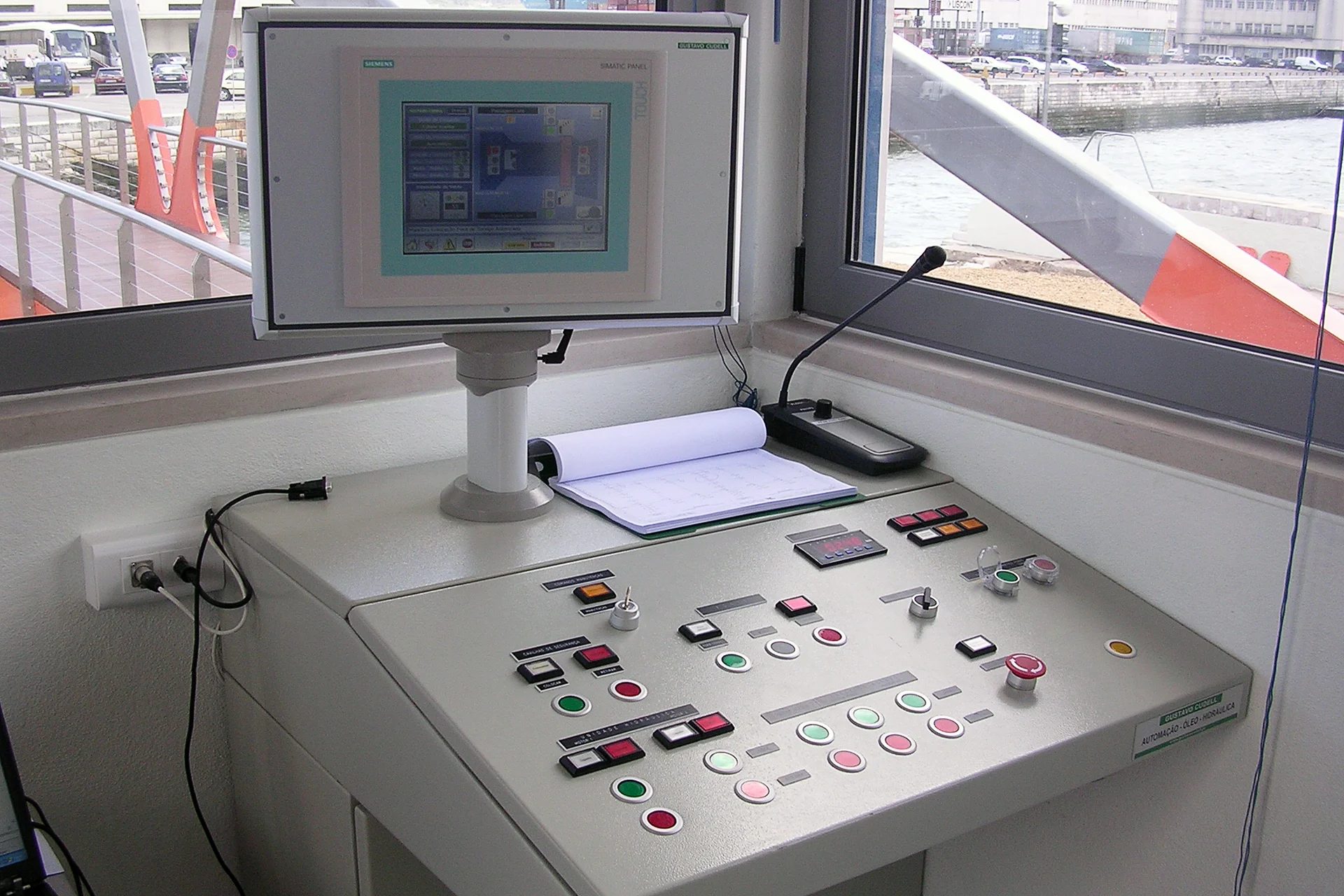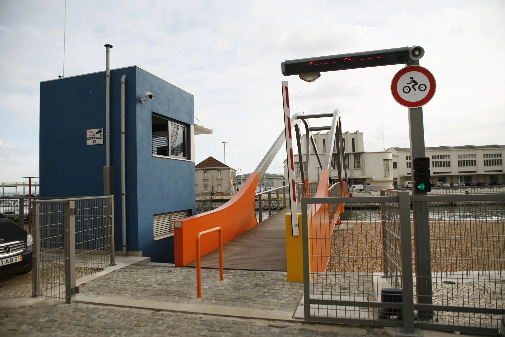 Ponte metálica rotativa, acionada por sistema óleo-hidráulico, por meio de 3 motoredutores. Comando automatizado, programável em cabine local e à distância, com transmissão de sinais por fibra óptica. Equipada com sistemas de vigilância e sinalização (CCTV e som), quadros digitais de informação aos pedestres e ao tráfego marítimo e cancelas basculantes.