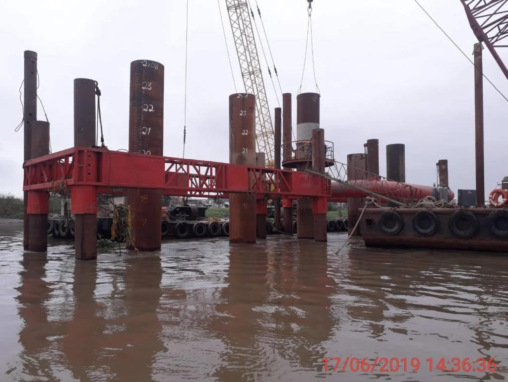 As fundações são sobre estacas metálicas circulares, cravadas no leito rochoso, com D=1500mm e esp.=38mm.