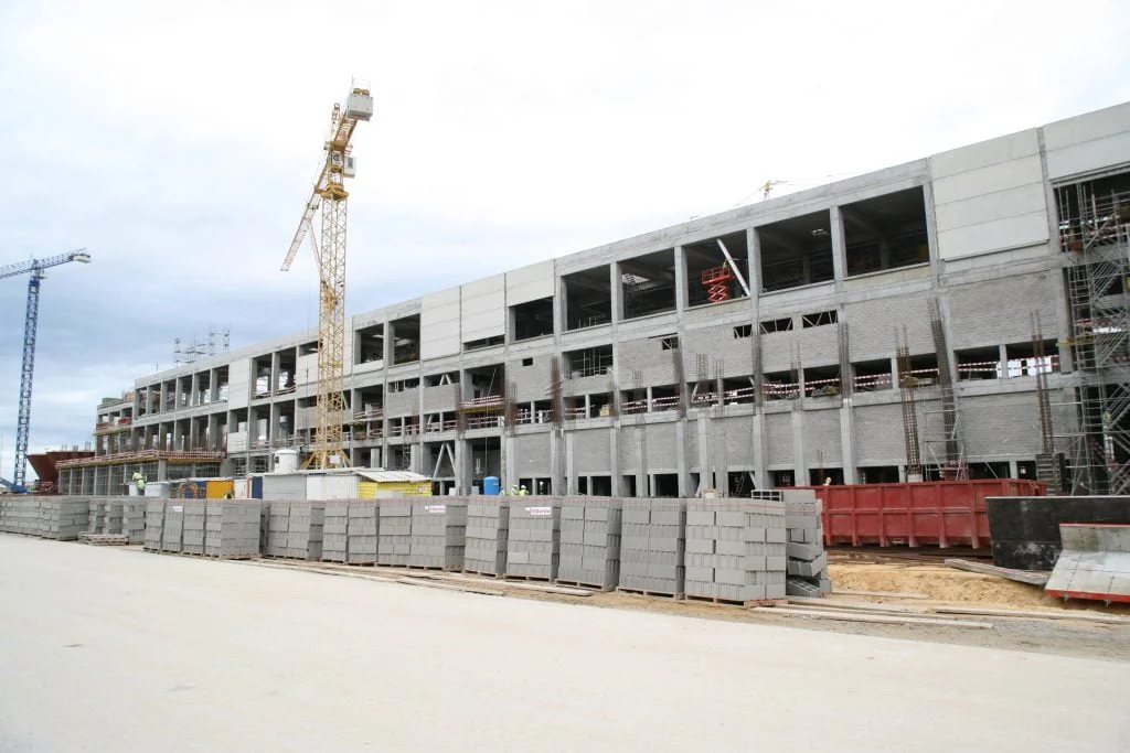Cobertura metálica revestida a chapa isotérmica, fachadas em blocos de betão e painéis pré-fabricados revestidos e painéis metálicos.