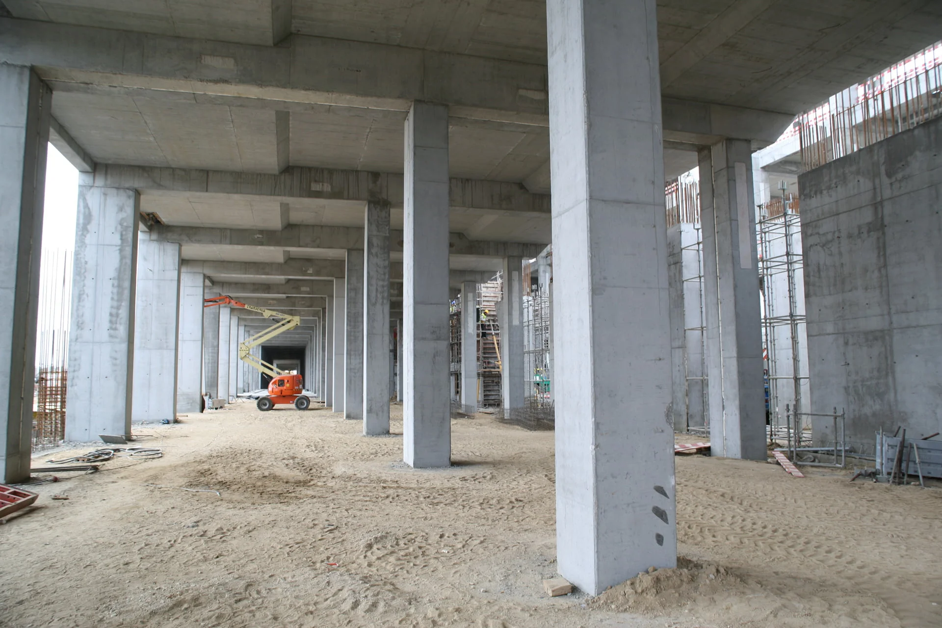 Execução de fundações por maciços de encabeçamento, estrutura de betão armado coberta por pilares, vigas e lajes.