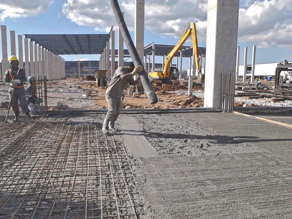 Construção das fundações, estruturas em concreto pré-moldado e pisos industriais, referentes às edifcações das oficinas de soldagem, montagem e pintura para fábrica de automóveis. As três edifcações têm área total de 58.000 m².
