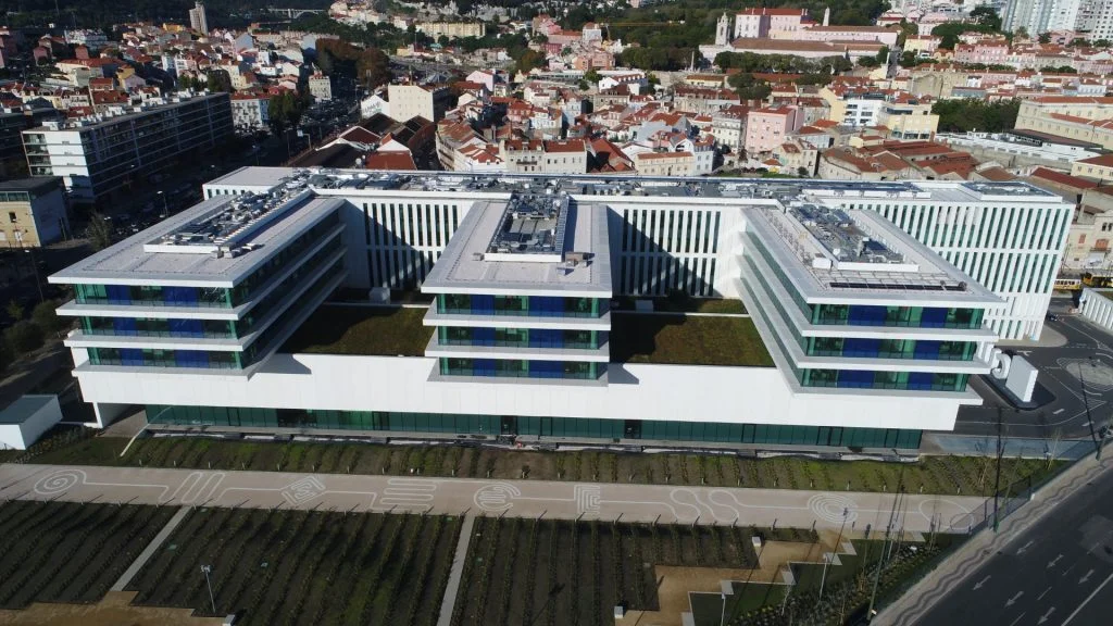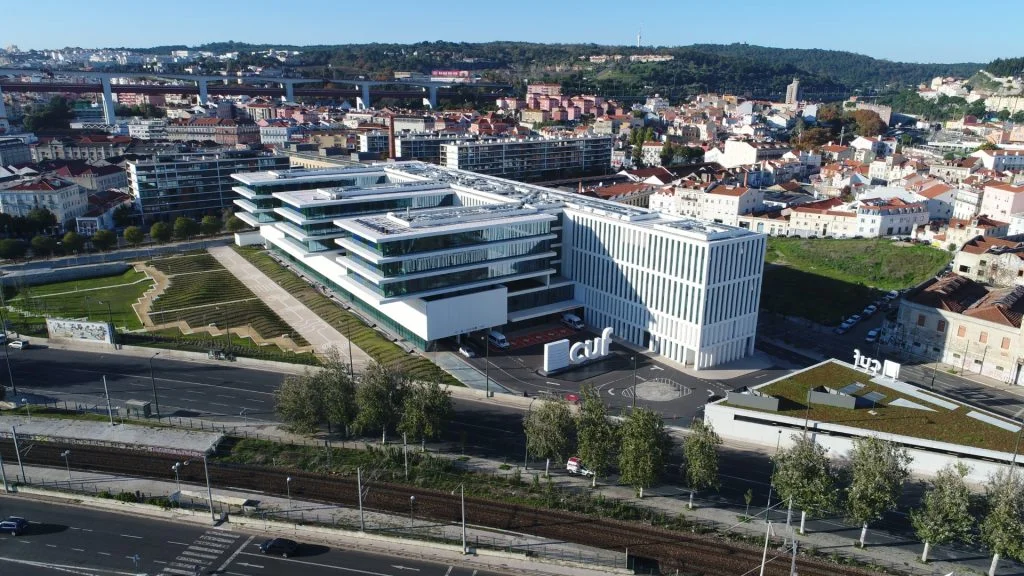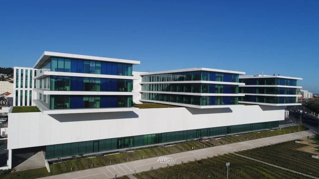 Construção caracterizada por fachadas de alumínio e vidro, embelezadas com revestimento em módulos de GRC (glass fiber reinforced concrete) e nos interiores com revestimentos vinílicos em pavimentos, paredes em painéis fenólicos e tetos falsos em gesso cartonado e painéis metálicos, na generalidade dos espaços.