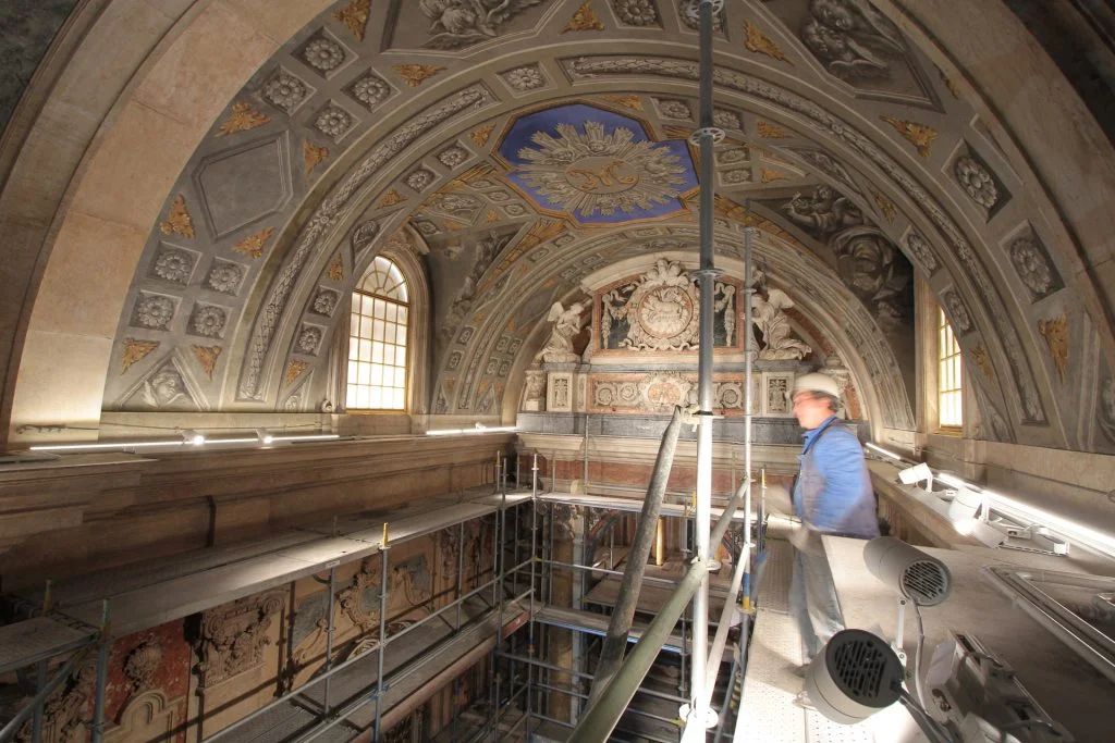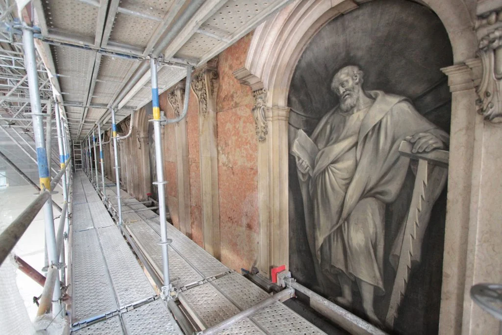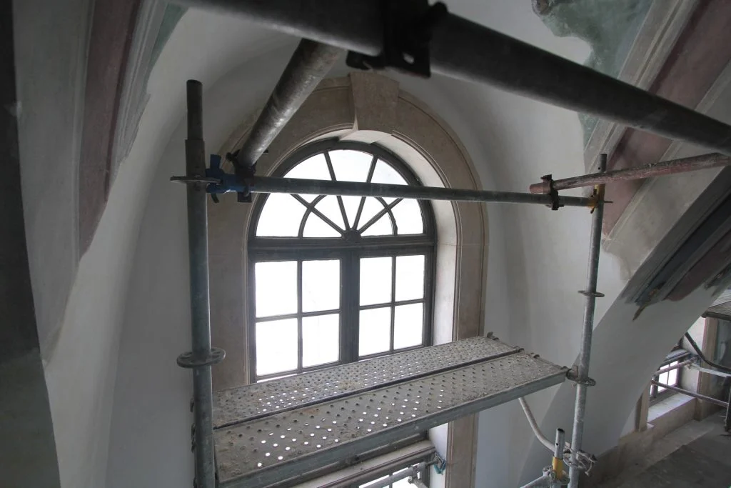 Após montagem de uma estrutura complexa de andaimes do tipo “Layher”, em aço galvanizado e alumínio, esta foi revestida com rede dupla de cor branca, foram realizados trabalhos de limpeza, consolidação, integração volumétrica e cromática, conservação e restauro nas áreas das cantarias, talha, estuque tradicional, pintura mural, douramento, segundo as técnicas tradicionais e as boas normas de arte e princípios na área da conservação e restauro.