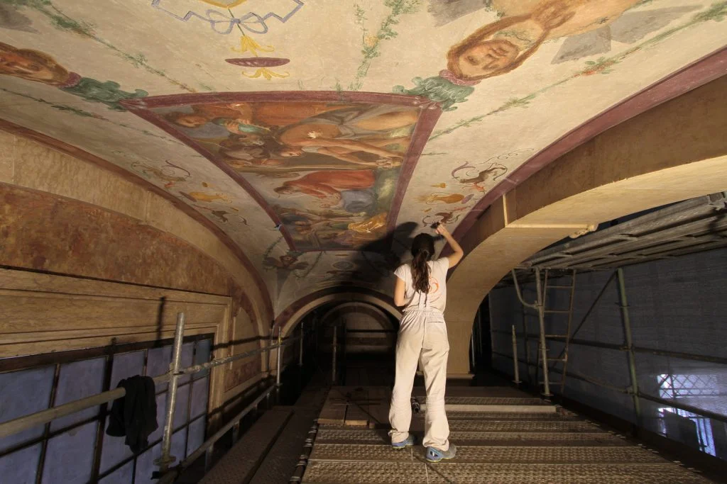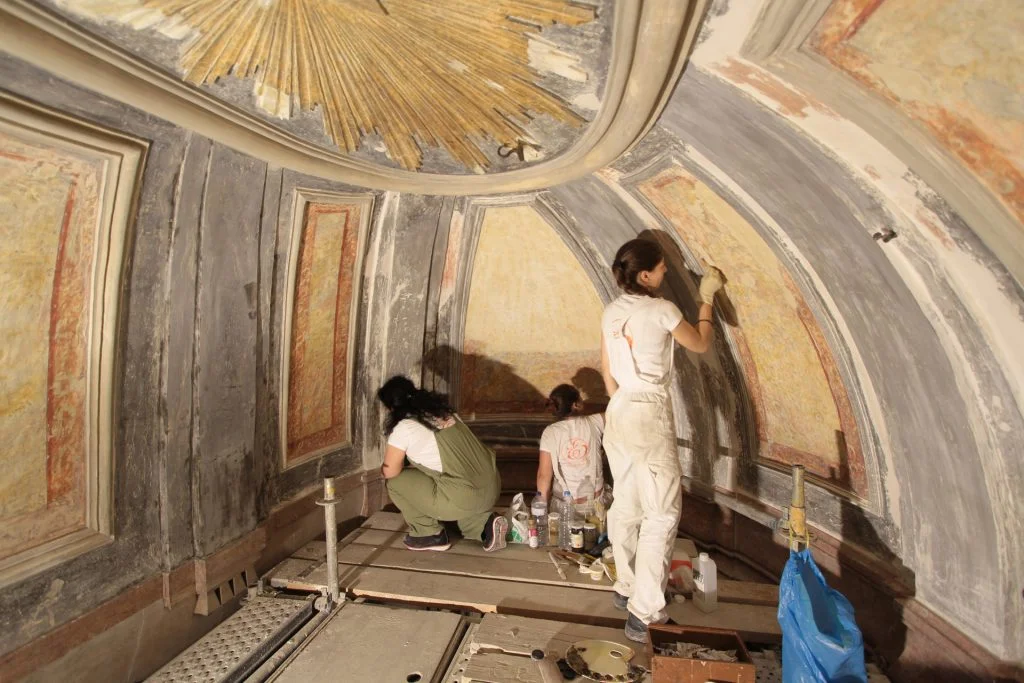 Foram removidas todas as argamassas incompatíveis (cimentícias) e aplicadas novas argamassas de cal e estuque segundo as metodologias tradicionais.