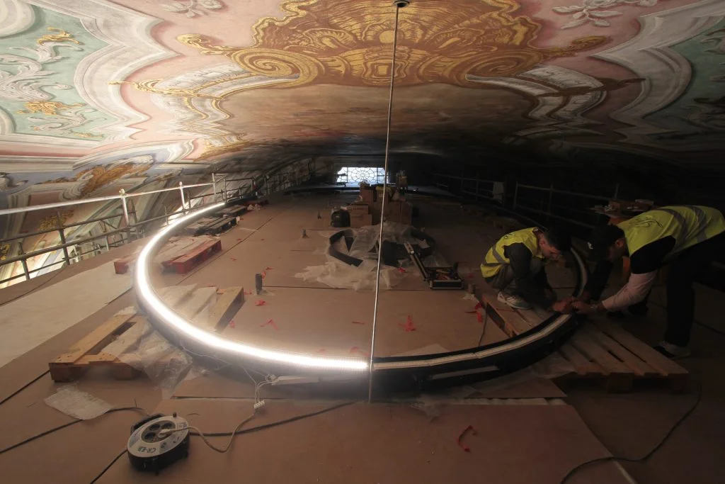 Foram removidos toda a cablagem e equipamentos que se encontravam sem uso e sem energia e reestruturados seis novos esquemas de quadros elétricos a partir do quadro elétrico principal. Foi montada nova tubagem e cablagem em abraçadeiras posicionadas na cornija superior. Onde a cablagem se encontrava à vista, foi utilizada tubagem de cobre, fixa em abraçadeiras de inox. Foi projetada uma estrutura elíptica (eixo maior = 14,70m e eixo menor = 6,90m) no âmbito de um projeto de luminotecnia e instalada uma iluminação que permite realçar através da projeção de feixes de luz controlados, o teto da autoria de Pedro Alexandrino de Carvalho (Séc. XIX) e elementos arquitetónicos e salientar algumas gravuras e pinturas canónicas distribuídas nos paramentos da nave. As luminárias tipo lustre com duas componentes, são constituídas na parte superior da elipse com tiras de LED de luz indireta e na parte inferior com 64 projetores esféricos de luz direta, permitindo uma regulação a 359°.