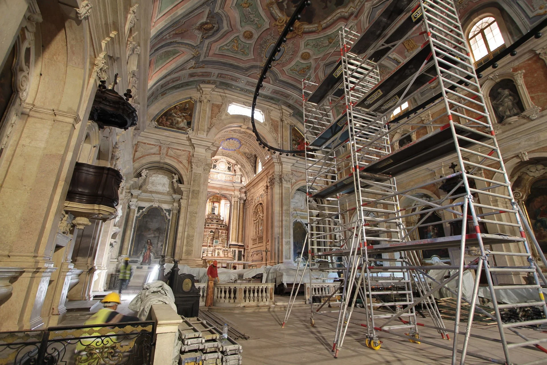 Após montagem de uma estrutura complexa de andaimes do tipo “Layher”, em aço galvanizado e alumínio, esta foi revestida com rede dupla de cor branca, foram realizados trabalhos de limpeza, consolidação, integração volumétrica e cromática, conservação e restauro nas áreas das cantarias, talha, estuque tradicional, pintura mural, douramento, segundo as técnicas tradicionais e as boas normas de arte e princípios na área da conservação e restauro.