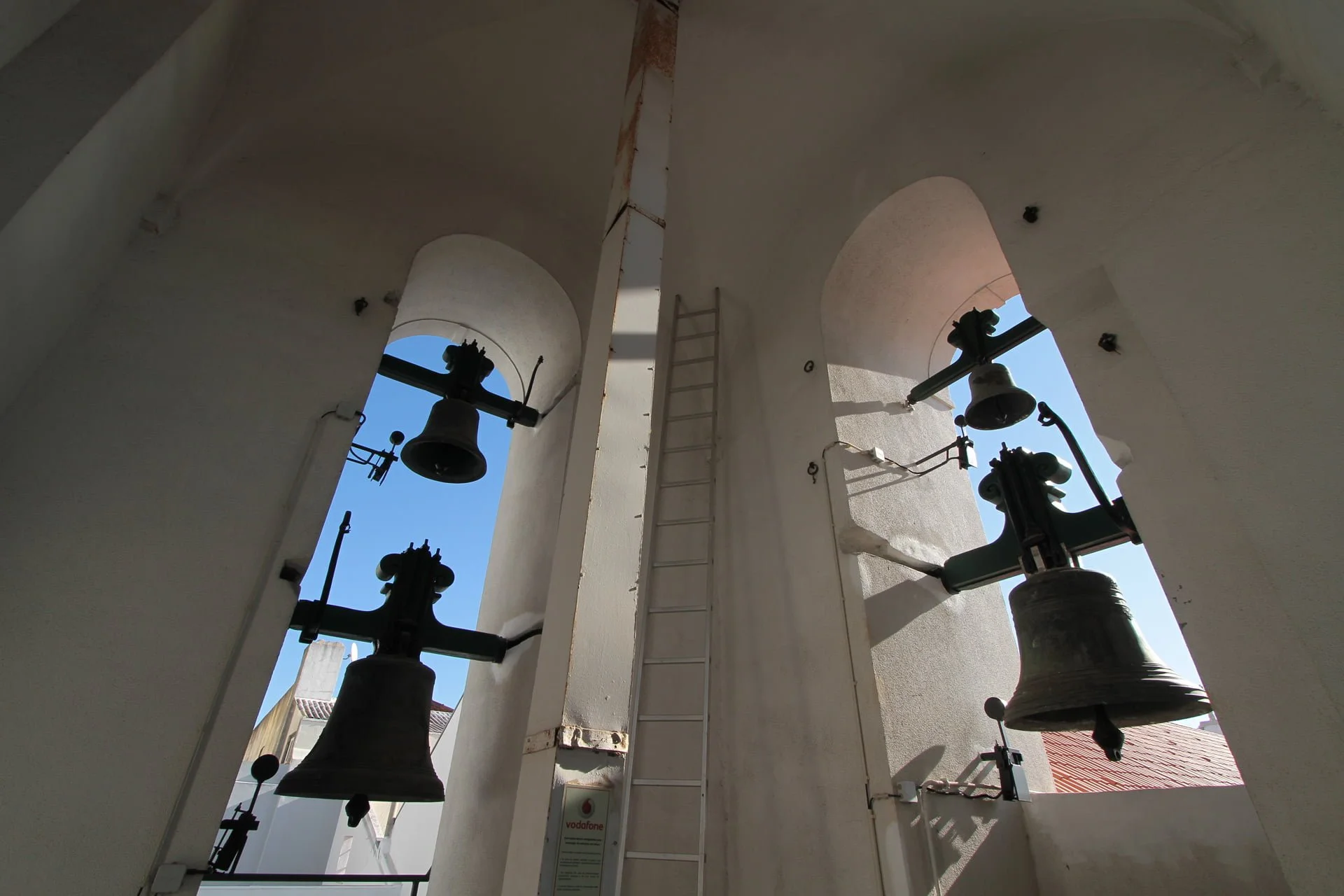 Os trabalhos consistiram na reabilitação, conservação e restauro dos sete sinos-cabeçalhos existentes na torre, cujo peso varia dos 42 Kg aos 620 Kg e o diâmetro de 0,44m a 1,00m. Os seis sinos mais pesados pertencem ao modelo Carrilhão. A intervenção nos sinos em bronze, incluiu a sua remoção para realizar a conservação e restauro de todos os cabeçalhos de madeira e ferragens em aço (asa do sino, argolas, tirantes, alsas, eixos, badalo e badaleira) e posterior recolocação; Foi instalado um sistema de automatismo de toques com a colocação de martelos de picar, para assinalar eventos litúrgicos (missas diárias, missas festivas, toques de chamada, etc.). Este automatismo ficou ligado a GPS para acerto automático das horas verão/inverno e interligado a um relógio computadorizado que toca horas e meias horas. Foi também colocado no paramento exterior da torre sineira (alçado Poente – virado para a Rua da Misericórdia), um mostrador com 1,20 m de diâmetro, constituído por um par de ponteiros em alumínio pintado, dois aros e numeração romana em aço metalizado e pintado, ficando à vista o fundo da pedra da torre.
