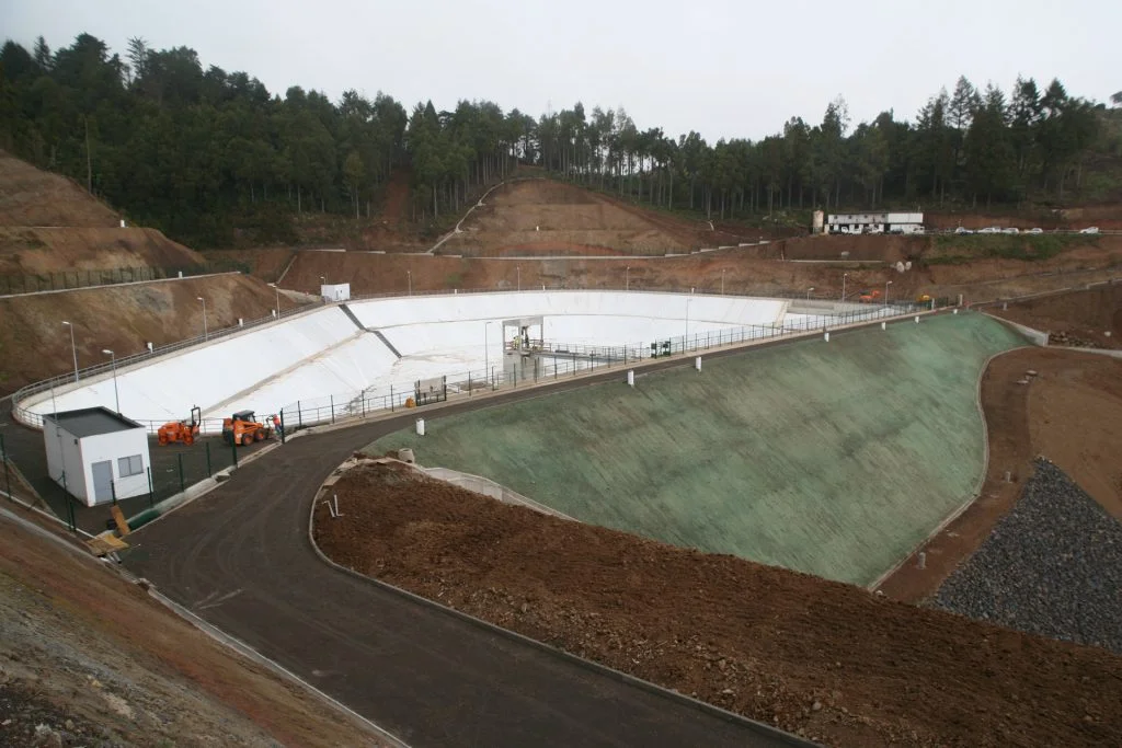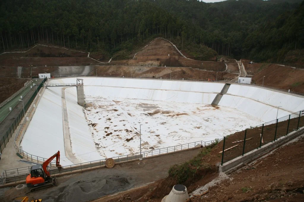 – Sistema de impermeabilização da lagoa constituído por uma geomembrana (tela de PEAD), cobrindo todas as superfícies do reservatório, com dois níveis de ancoragem |na banqueta intermédia e ao longo do coroamento e berma à cota 740).