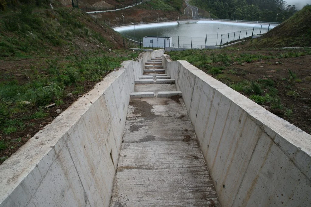 – Sistema de adução/derivação de água da levada para a barragem, localizada junto à Levada da Serra do Faial, constituído por tubagem PEAD DN355, enterrada em vala, em que nas extremidades encontram-se duas câmaras de manobra e controlo: a câmara de derivação (dotada de comportas de seccionamento e grelha mecânica de limpeza automática) e a caixa de entrega (medição de caudal, válvulas de operação e controlo e picagem para rede de águas de serviço);