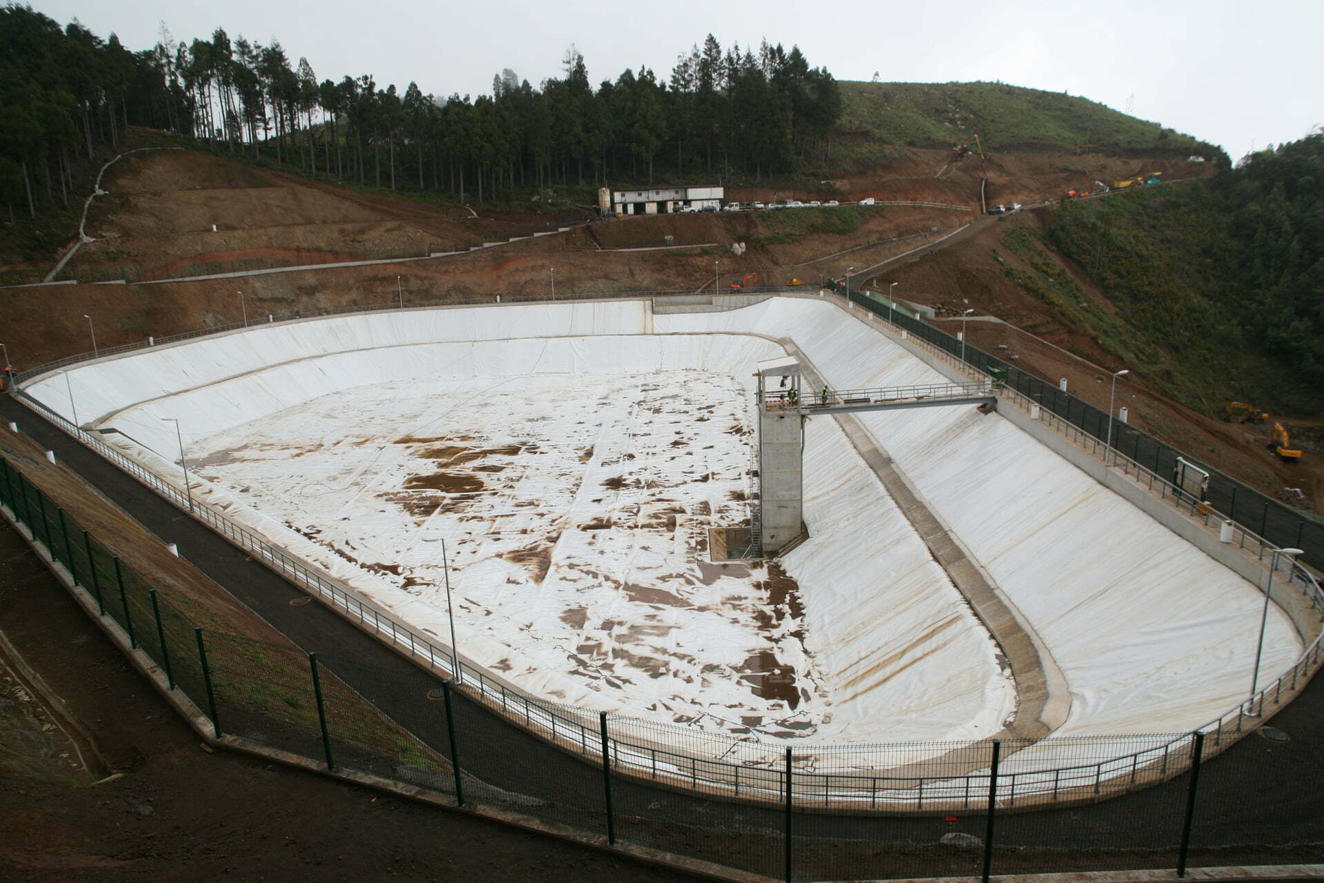 – Sistema de impermeabilização da lagoa constituído por uma geomembrana (tela de PEAD), cobrindo todas as superfícies do reservatório, com dois níveis de ancoragem |na banqueta intermédia e ao longo do coroamento e berma à cota 740).