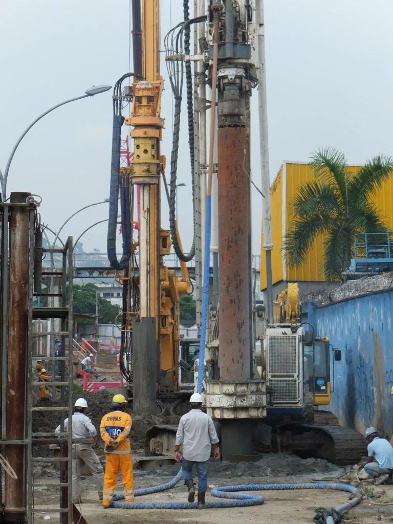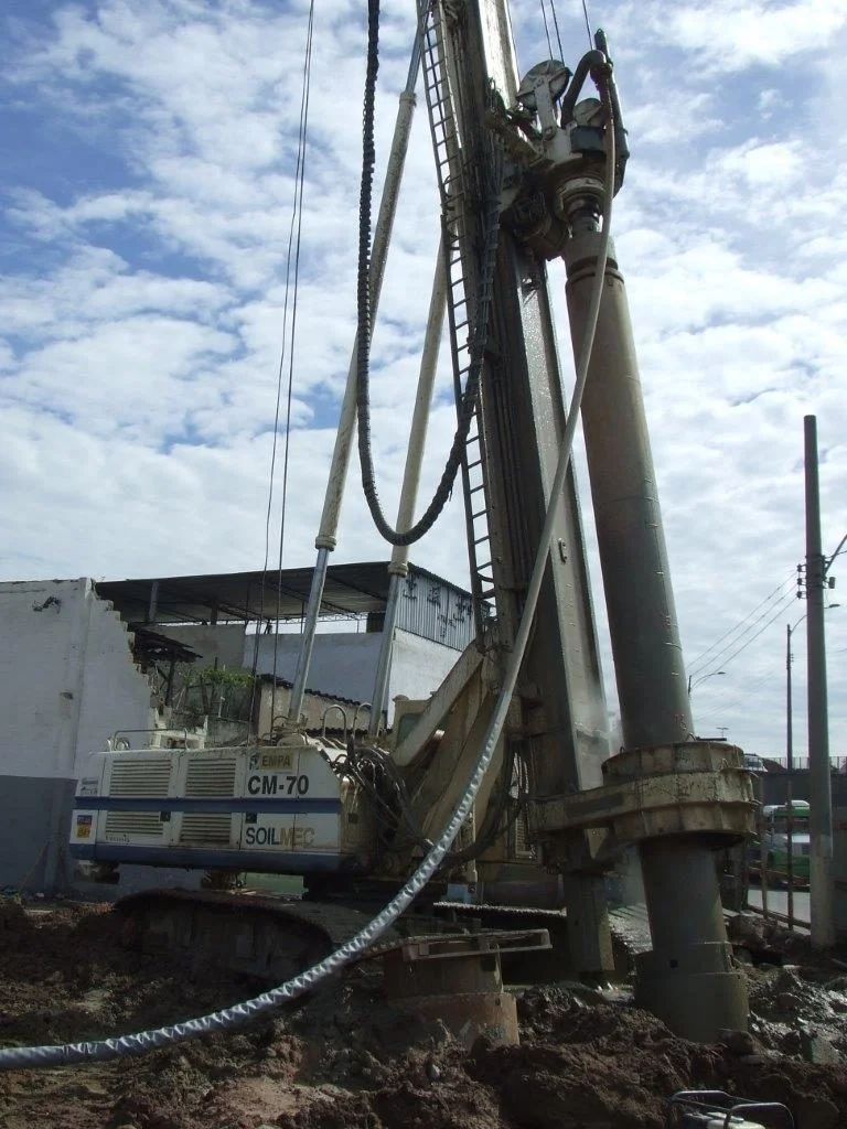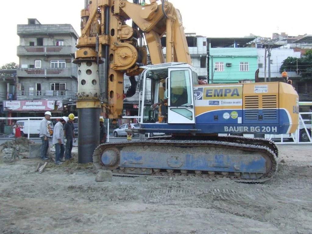 Execução de estacas escavadas de 800 mm com pino em rocha e com cravação de revestimento metálico perdido no trecho em solo num total de 2.000 m, sendo 600 m executadas em rocha.