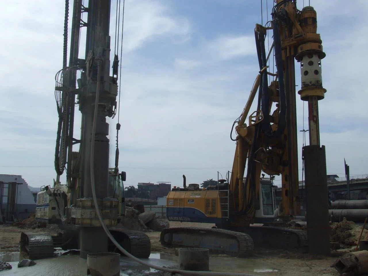 Execução de estacas escavadas de 800 mm com pino em rocha e com cravação de revestimento metálico perdido no trecho em solo num total de 2.000 m, sendo 600 m executadas em rocha.