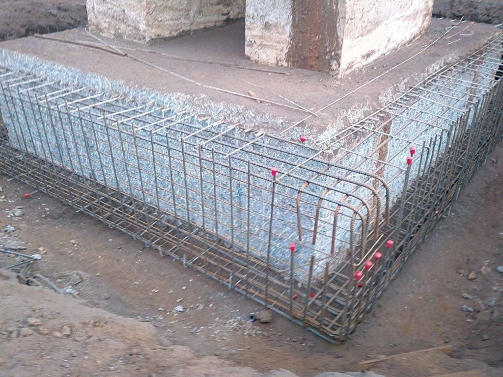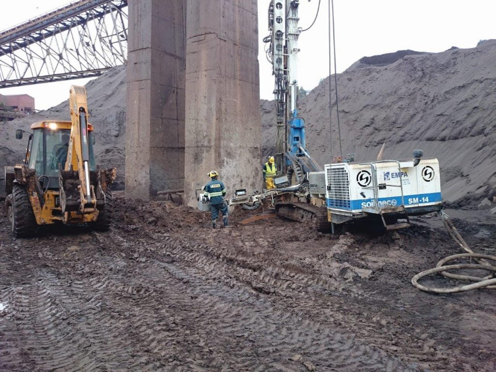 Execução do reforço da fundação de dois pilares de apoio de uma esteira transportadora através de um reforço de solo com colunas de Jet-Grouting e posterior alargamento dos blocos dos pilares.