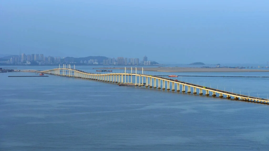 Construção da Ponte Macau-Taipa, na China, com comprimento total 4.534 ml. A ponte é suspensa por tirantes, construída com vigas e em concreto, sendo de forma ondulada.