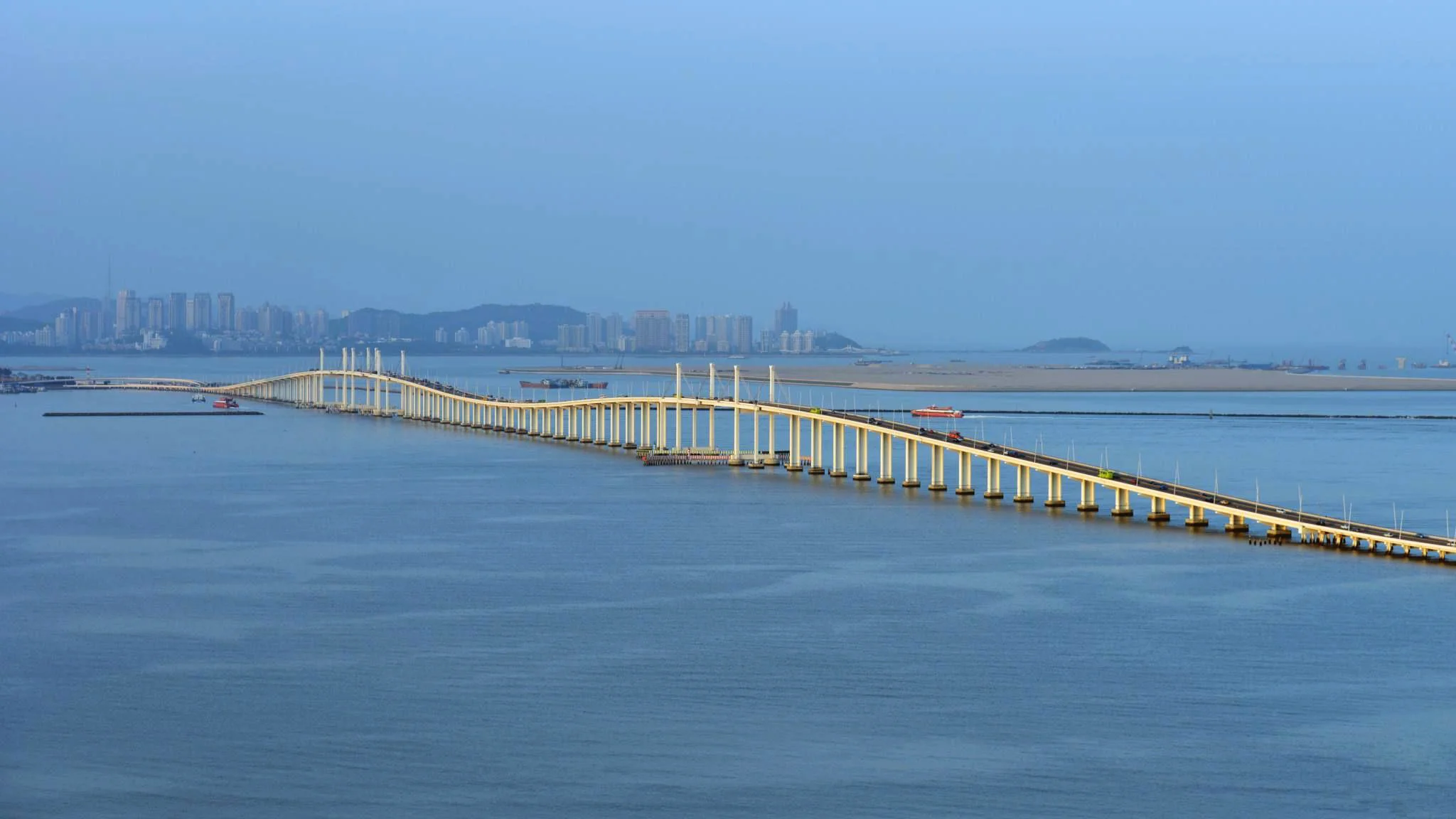 Construção da Ponte Macau-Taipa, na China, com comprimento total 4.534 ml. A ponte é suspensa por tirantes, construída com vigas e em concreto, sendo de forma ondulada.