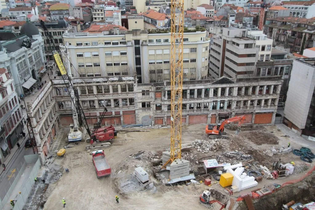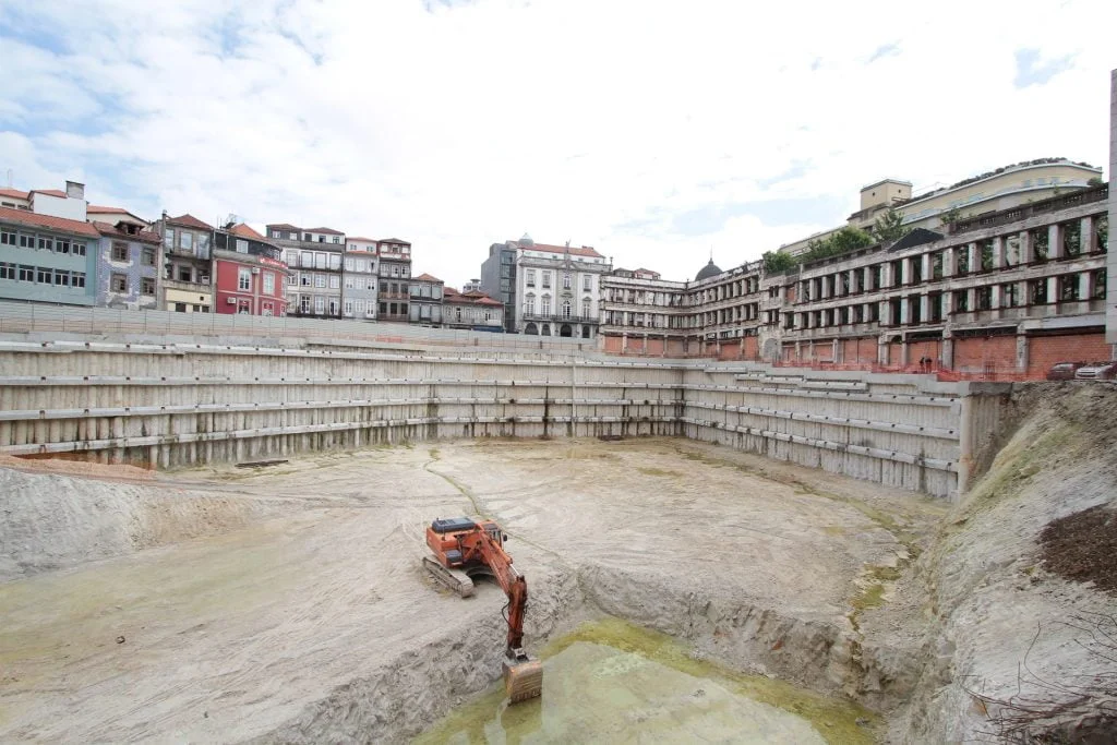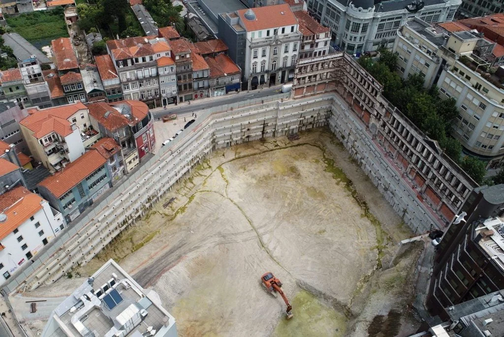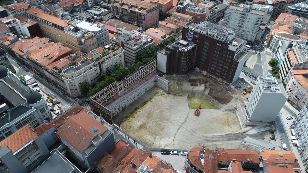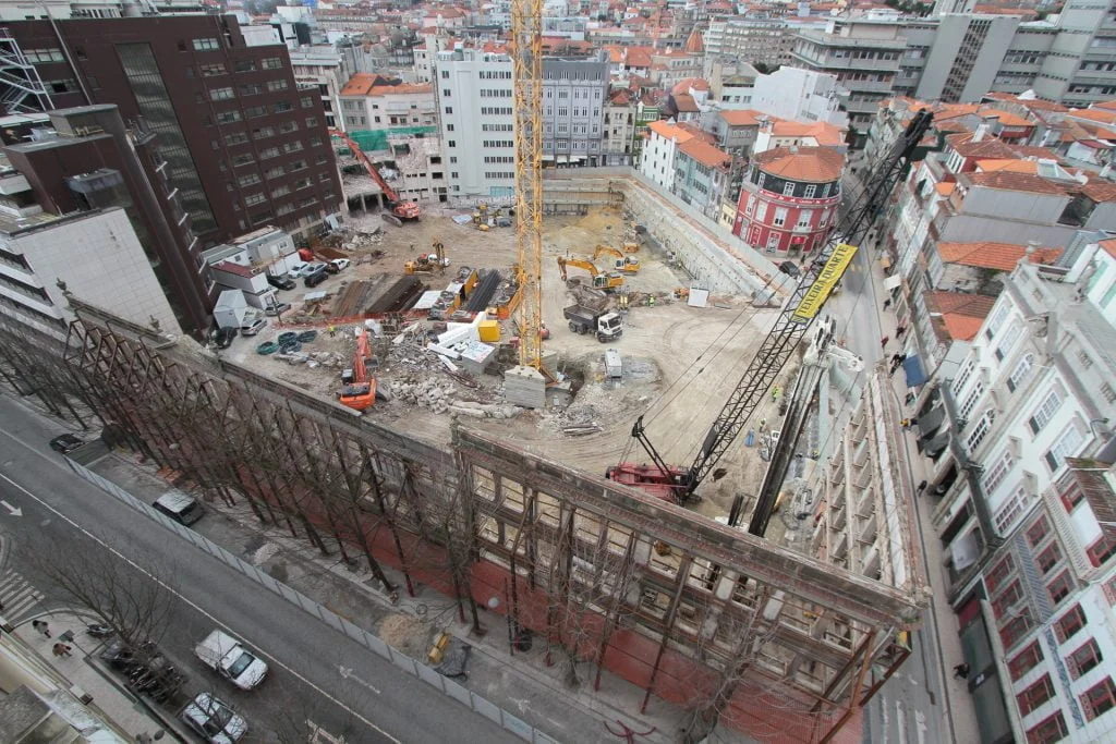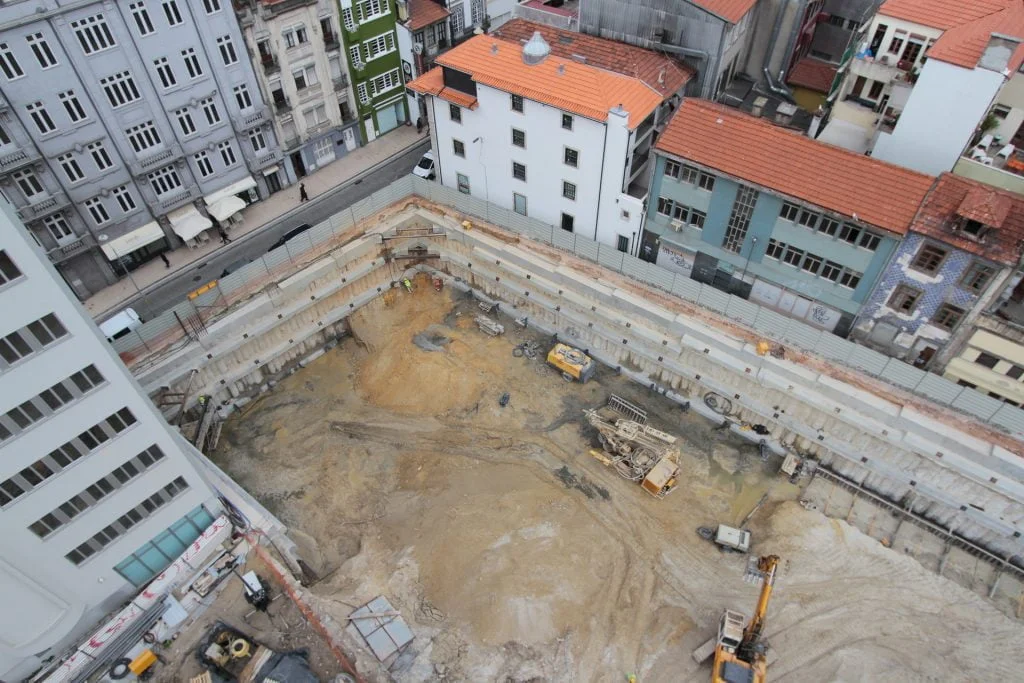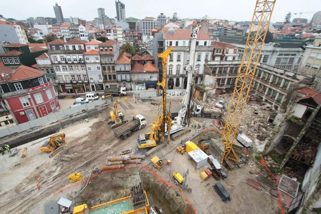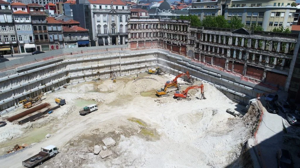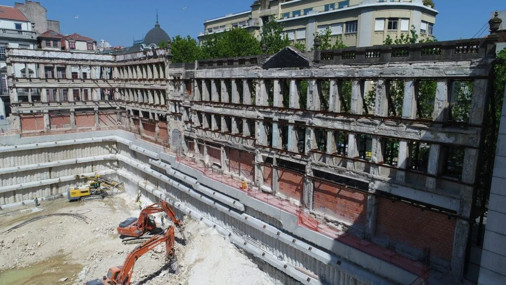 demolição do edifício LOOP e Edificado na Rua Sá da Bandeira (? 15.000 m3 RCDs), contenção de fachadas, escavação e contenção periférica por cortina de estacas secantes de Ø 600mm.