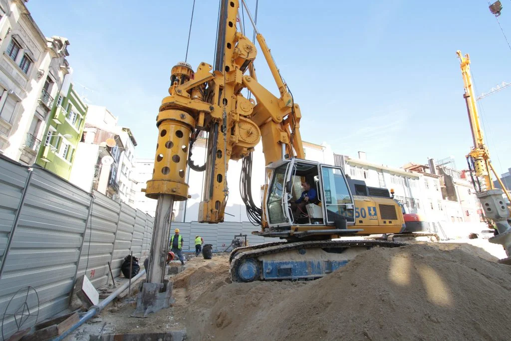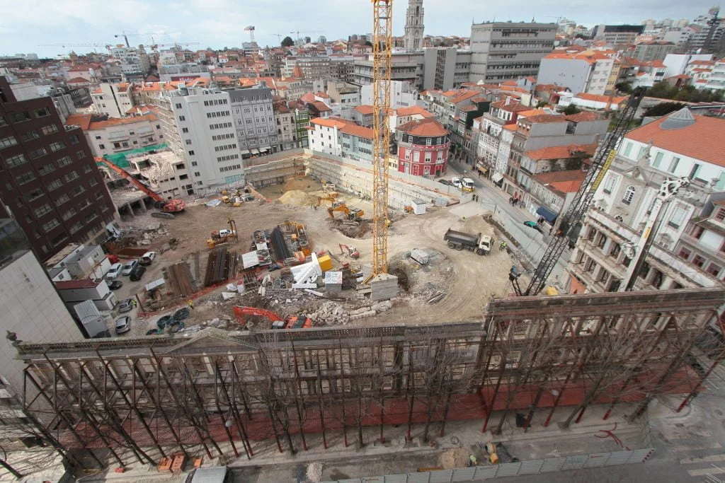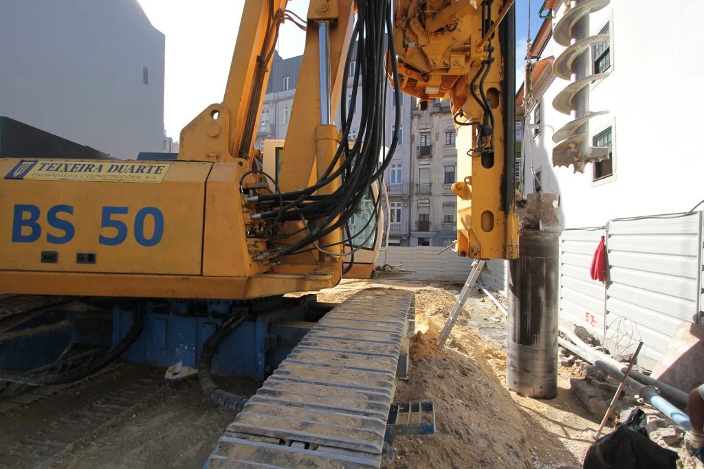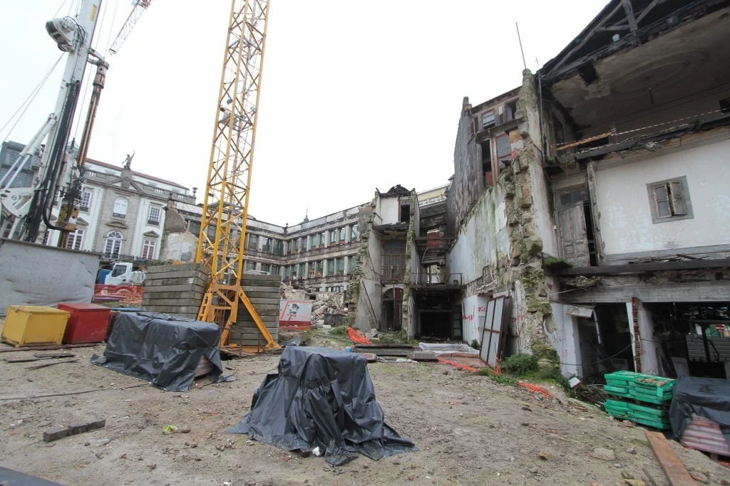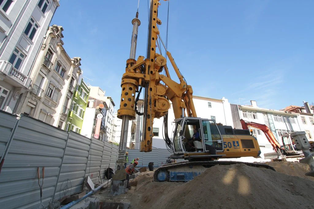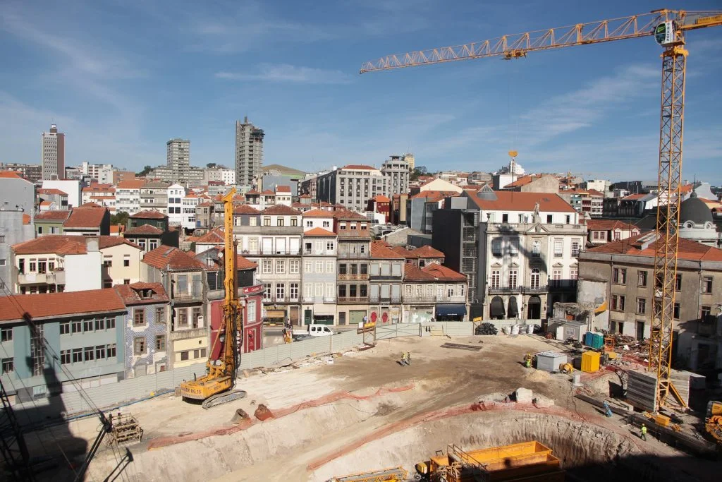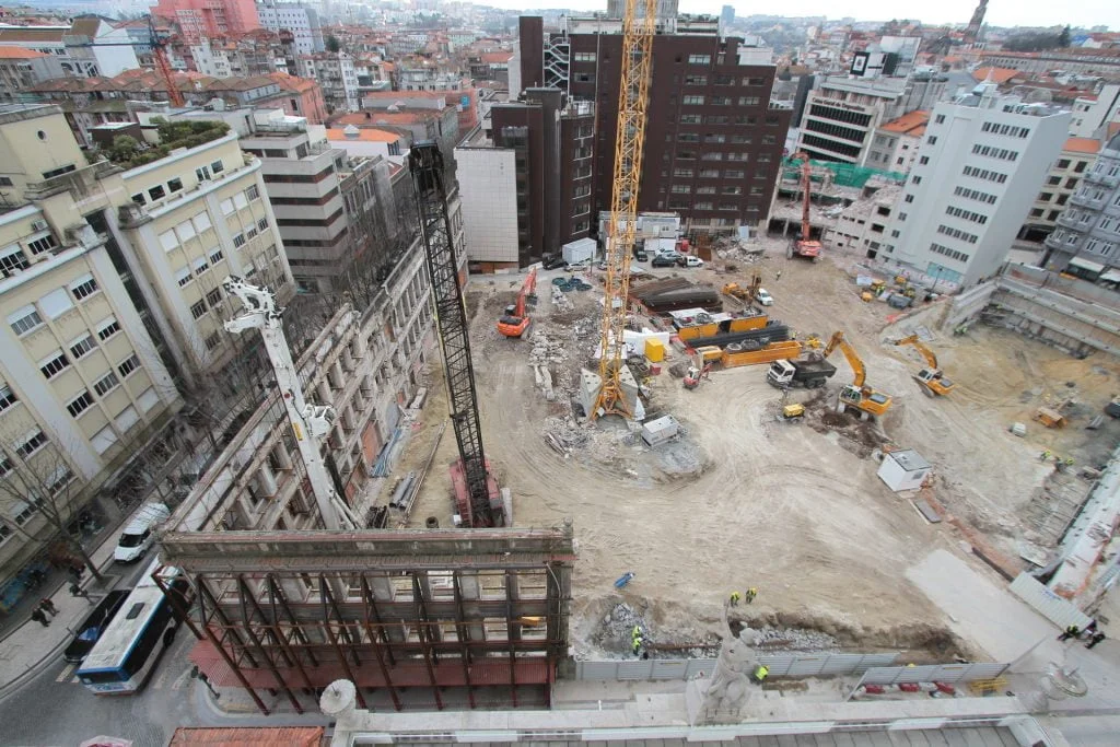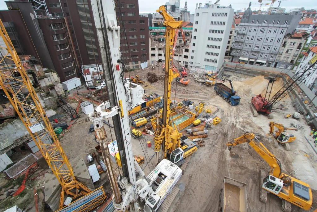 demolição do edifício LOOP e Edificado na Rua Sá da Bandeira (? 15.000 m3 RCDs), contenção de fachadas, escavação e contenção periférica por cortina de estacas secantes de Ø 600mm.