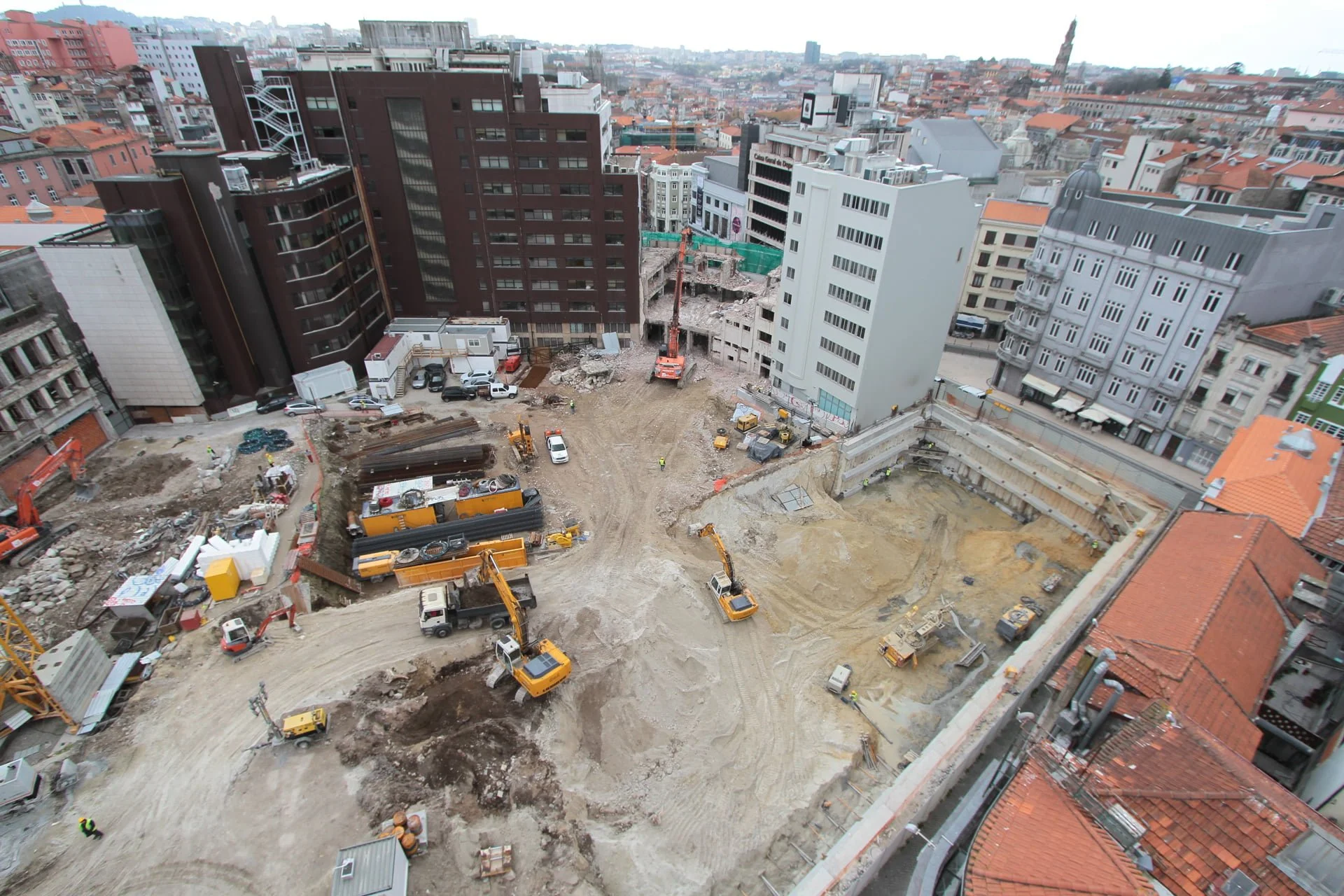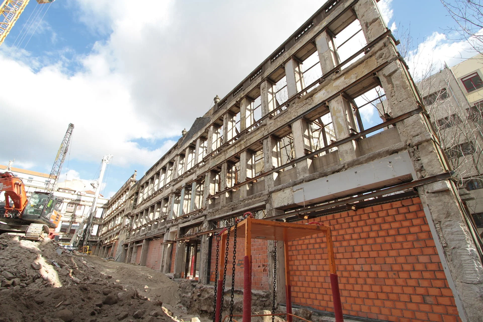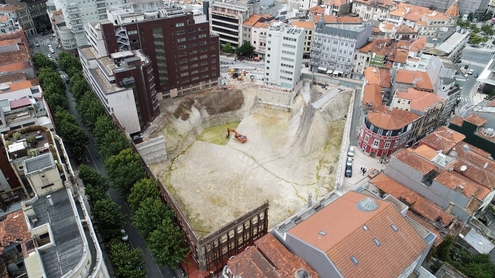 demolição do edifício LOOP e Edificado na Rua Sá da Bandeira (? 15.000 m3 RCDs), contenção de fachadas, escavação e contenção periférica por cortina de estacas secantes de Ø 600mm.