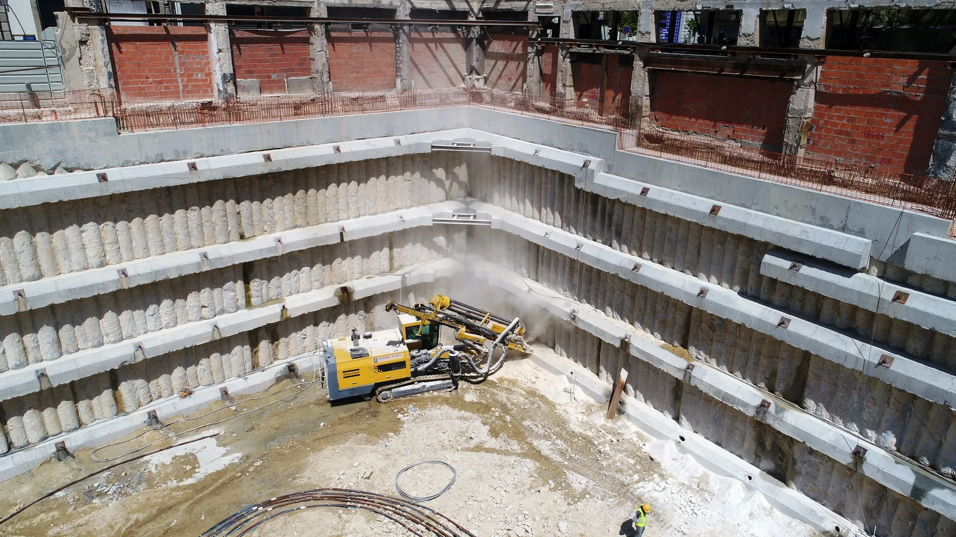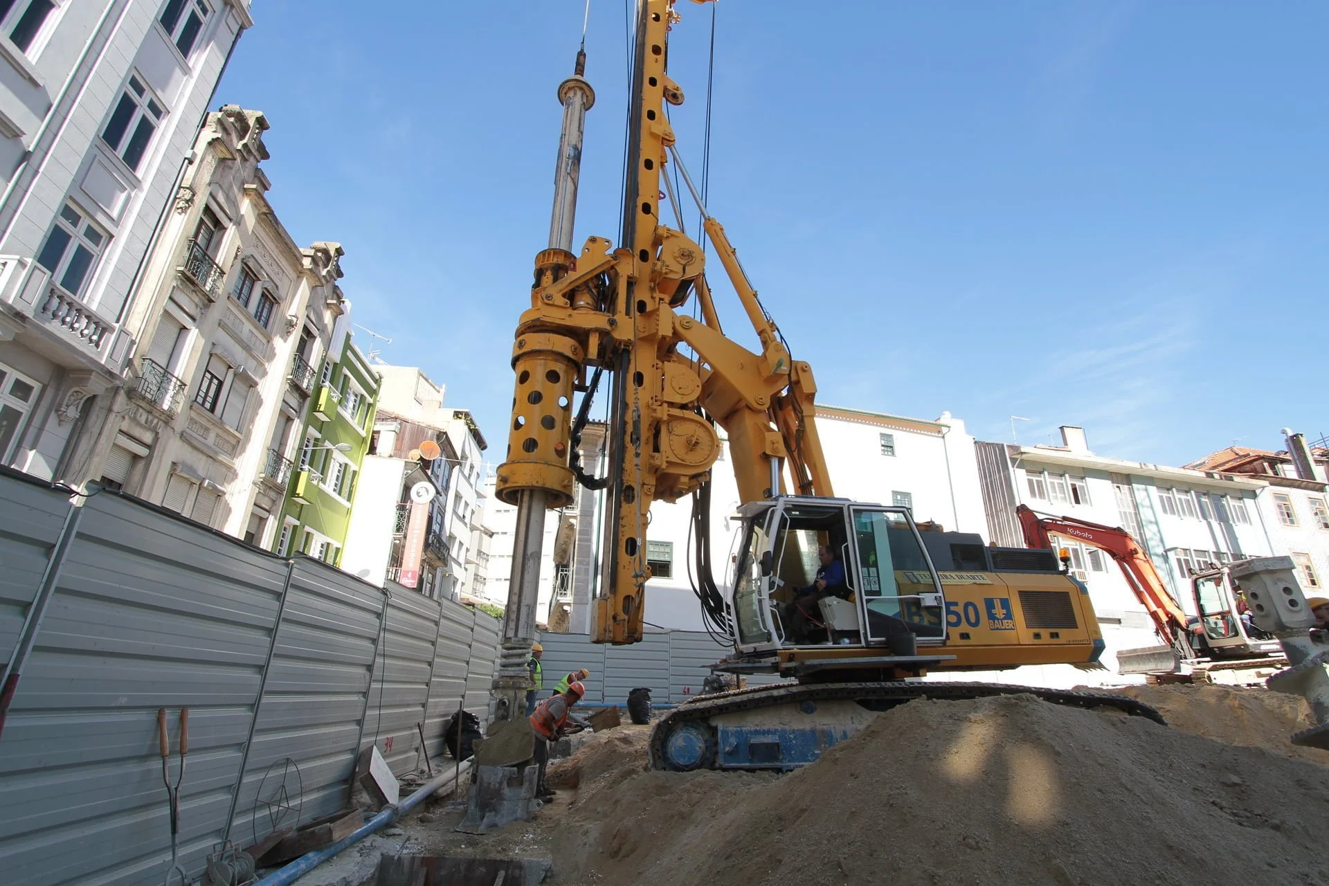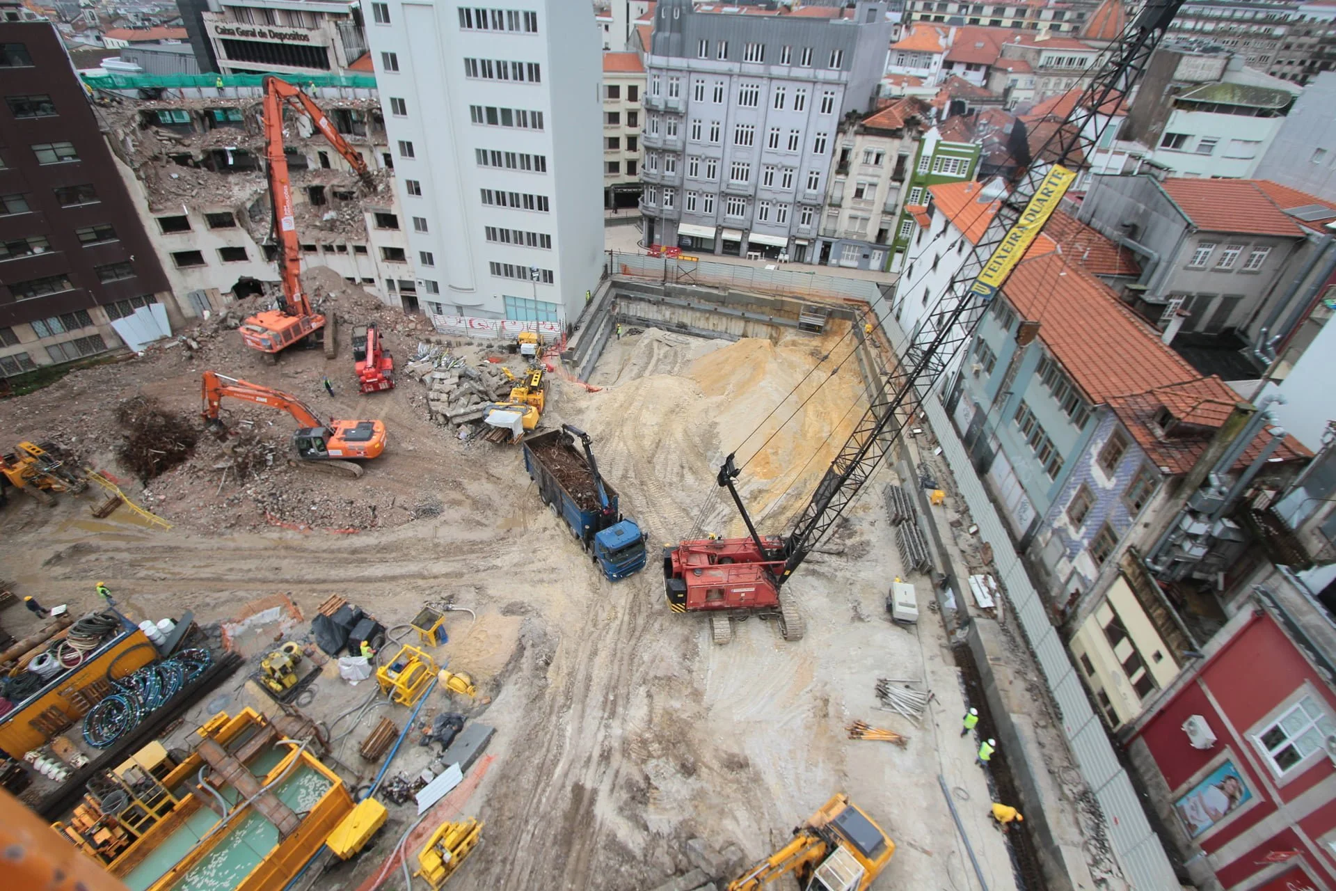 demolição do edifício LOOP e Edificado na Rua Sá da Bandeira (? 15.000 m3 RCDs), contenção de fachadas, escavação e contenção periférica por cortina de estacas secantes de Ø 600mm.