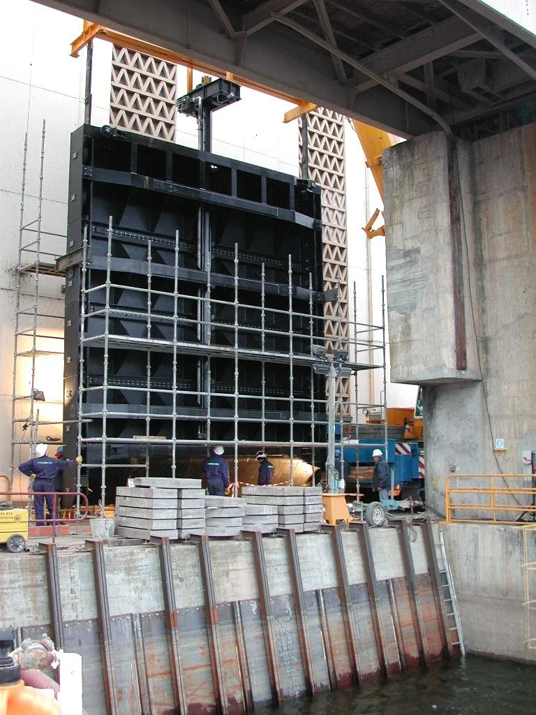Desmontagem das comportas e reparação das mesmas em oficina, concepção e construção de ensecadeira provisória para reparação das peças fixas a “seco”.
