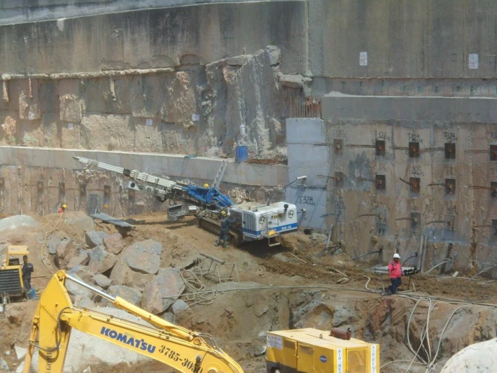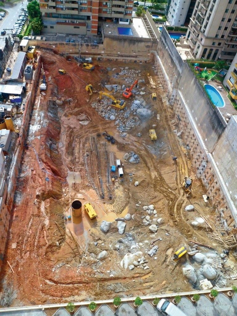 Execução de contenção periférica em parede diafragma com fluido estabilizante com ¨pinagem¨ em maciço rochoso e tirantes provisórios.