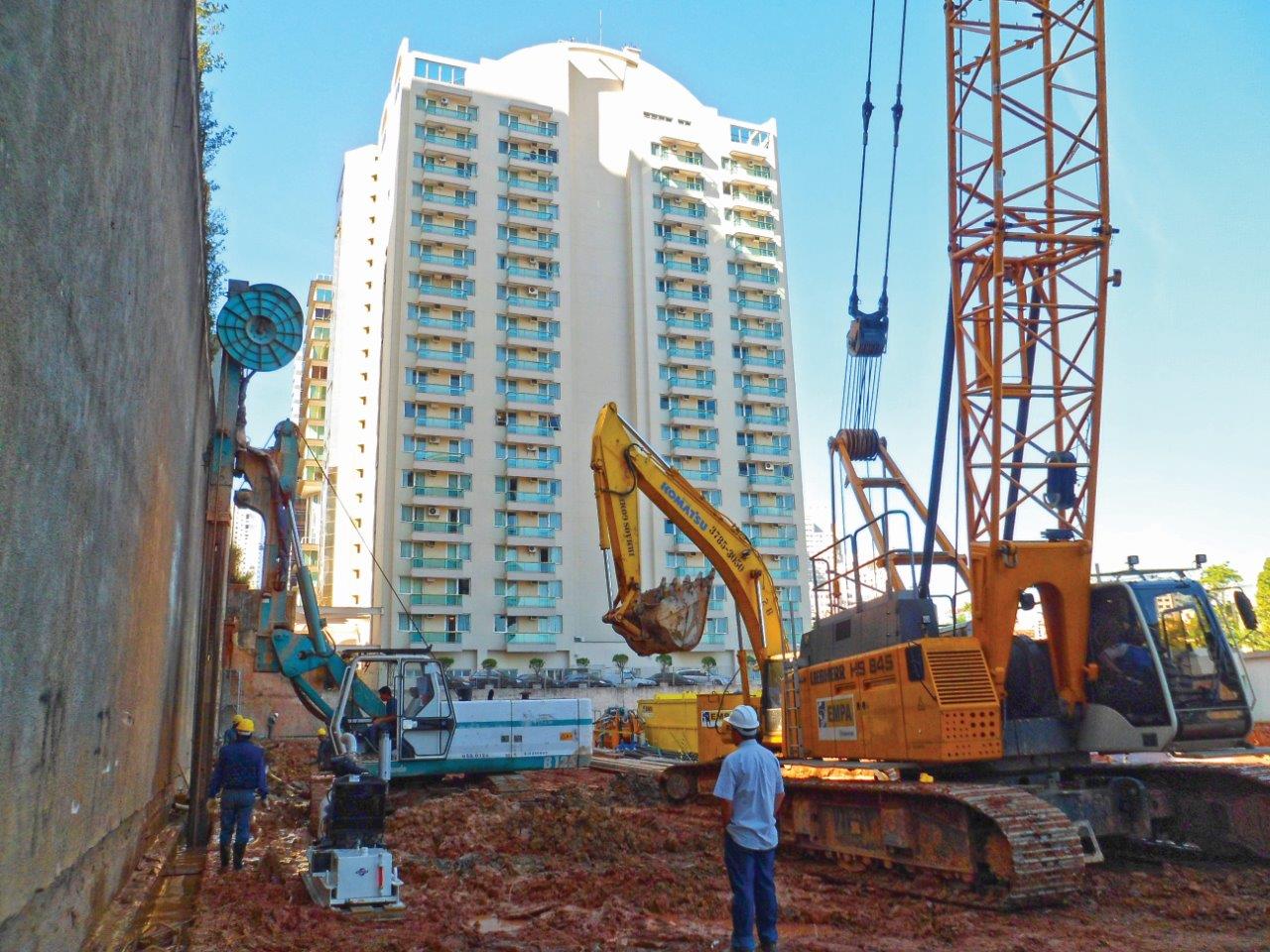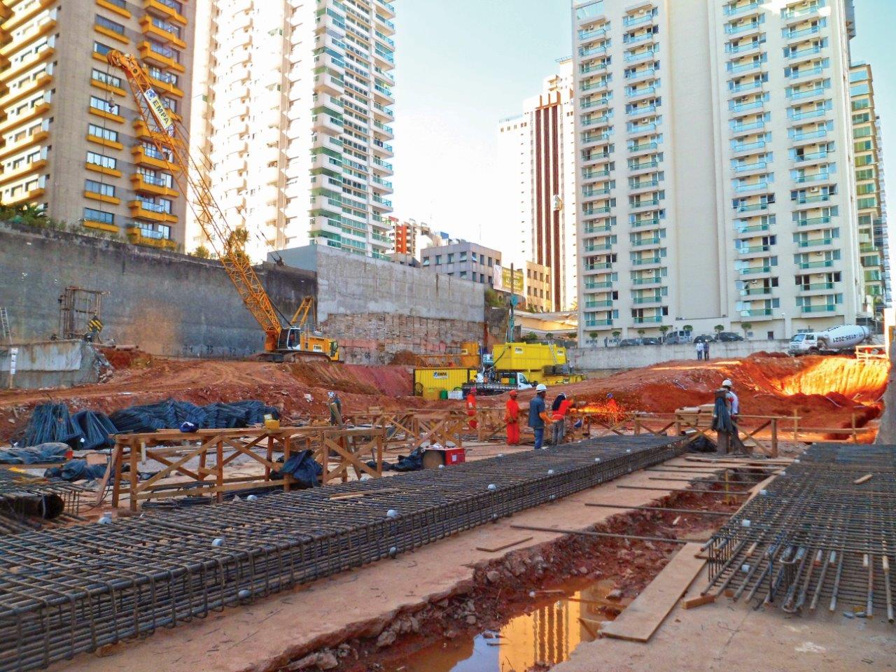 Execução de contenção periférica em parede diafragma com fluido estabilizante com ¨pinagem¨ em maciço rochoso e tirantes provisórios.