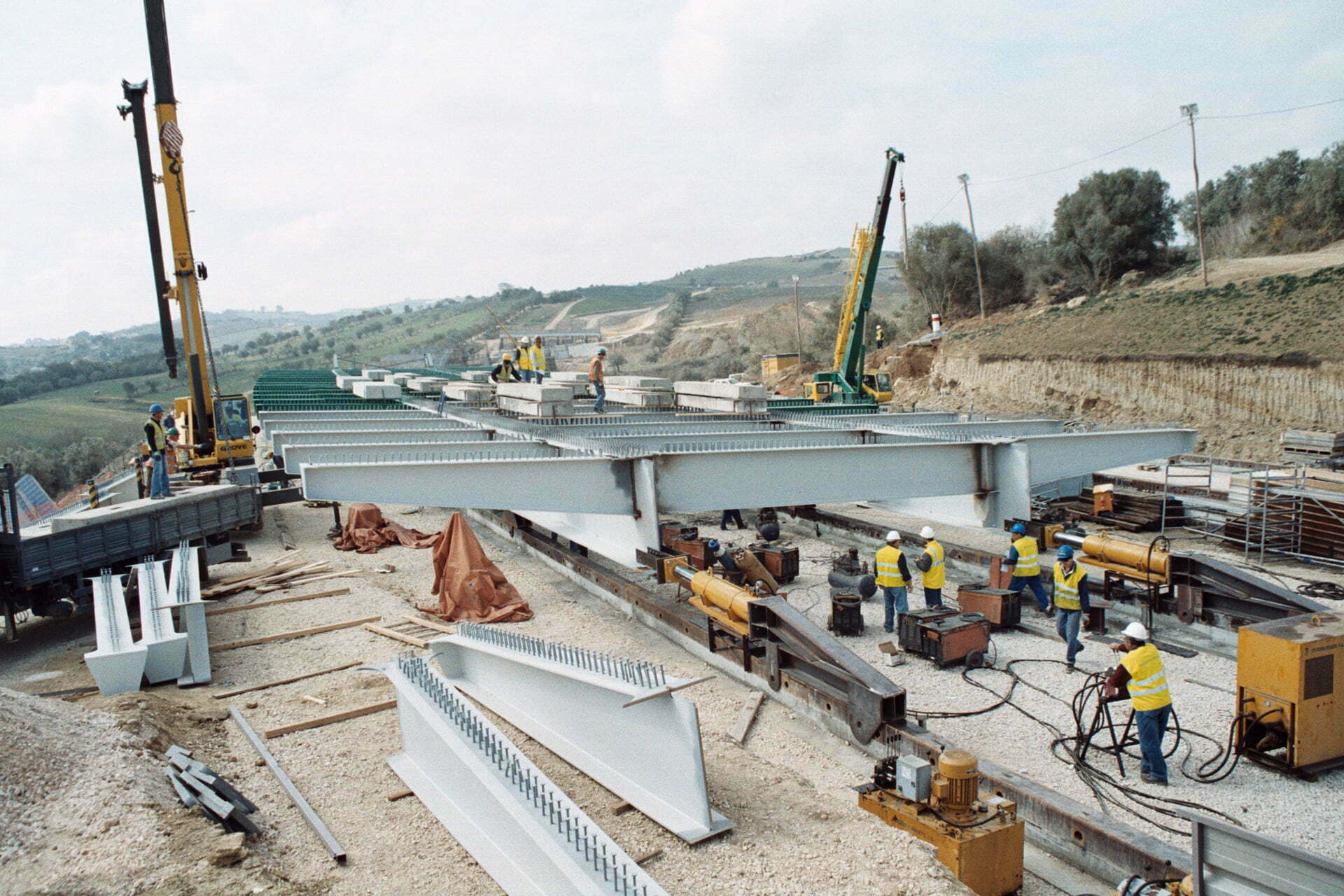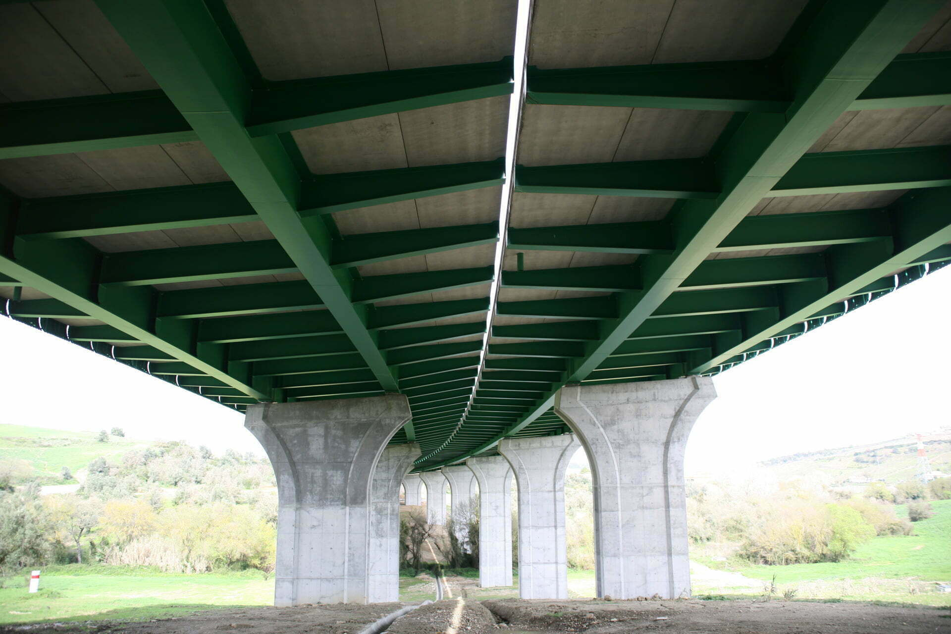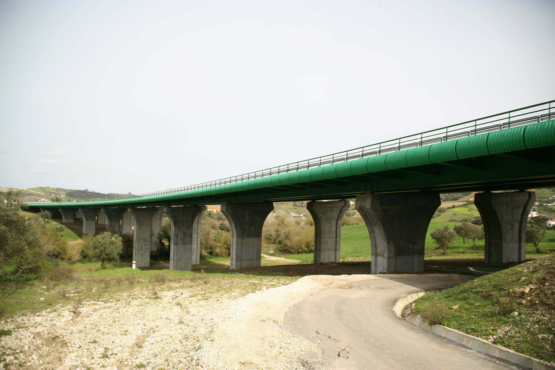 Construção do Viaduto de São Sebastião, na Rodovia A10 – Bucelas/Carregado/IP3, em Arruda dos VInhos, Portugal.  Viaduto com dois tabuleiros, cada um constituído por um vão extremo com 28 metros, sete com 36 metros e o outro extremo também com 28 metros, totalizando 308 metros de comprimento, apoiado em oito pilares e dois encontros.