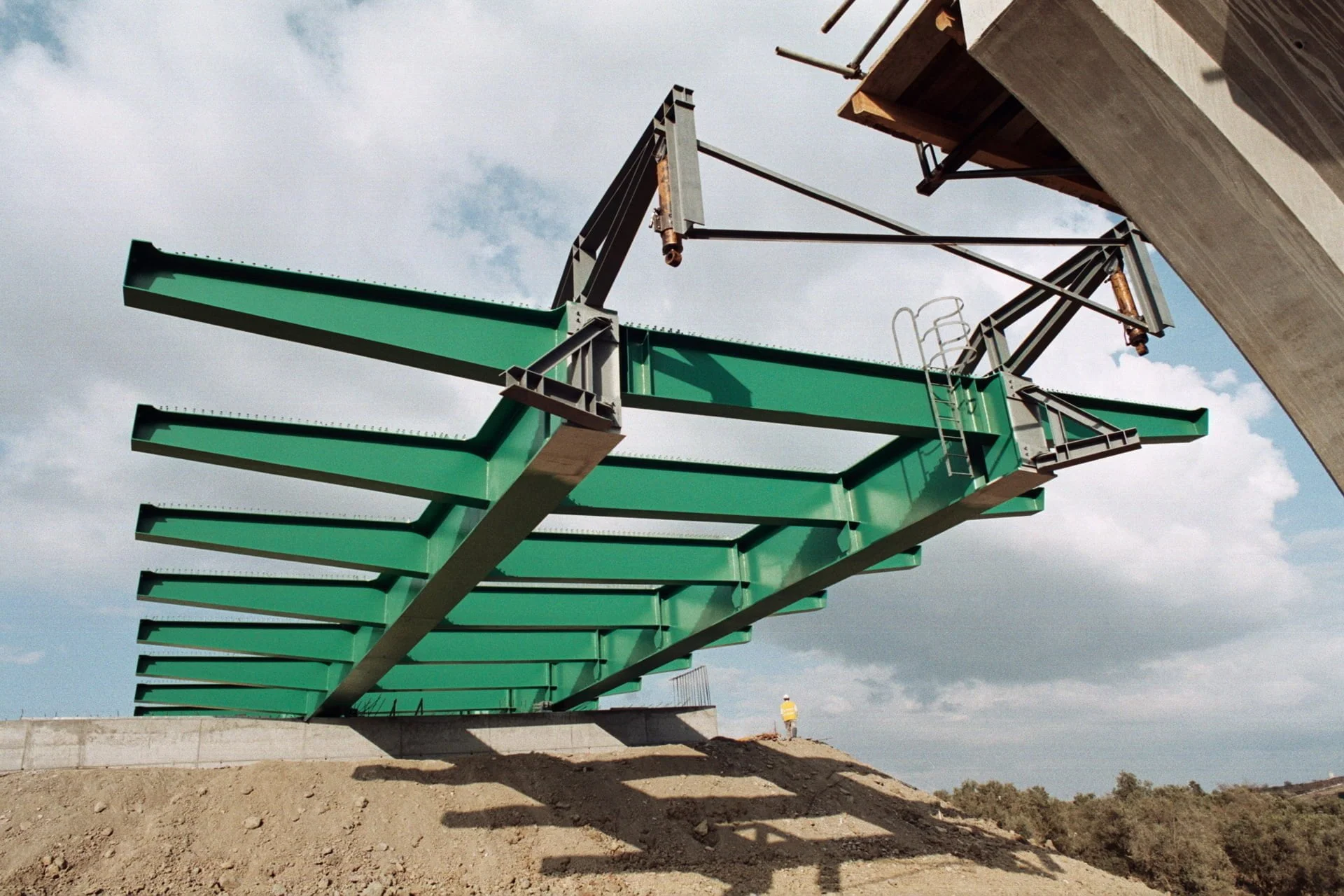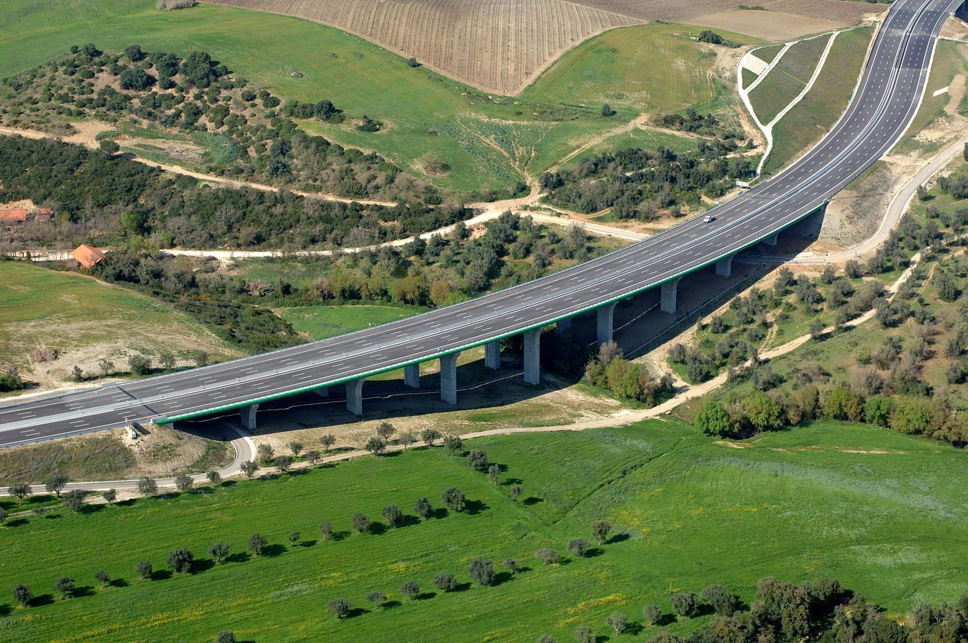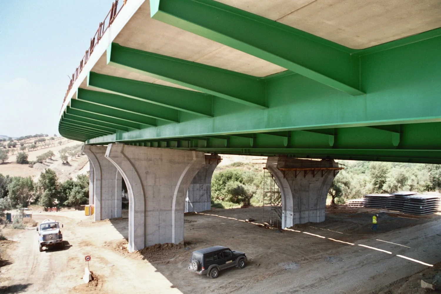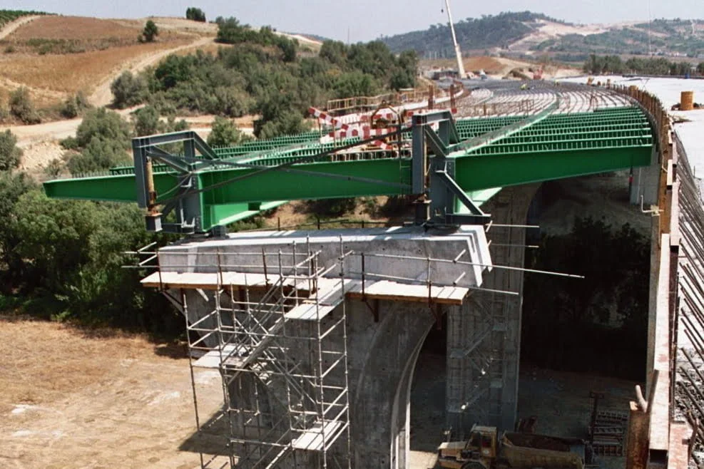 Construção do Viaduto de São Sebastião, na Rodovia A10 – Bucelas/Carregado/IP3, em Arruda dos VInhos, Portugal. Viaduto com dois tabuleiros, cada um constituído por um vão extremo com 28 metros, sete com 36 metros e o outro extremo também com 28 metros, totalizando 308 metros de comprimento, apoiado em oito pilares e dois encontros.